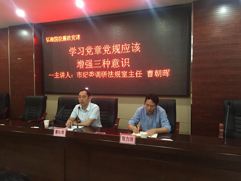 為慶祝建黨96周年,進(jìn)一步增強(qiáng)公司黨組織的凝聚力和戰(zhàn)斗力,提高黨員干部拒腐防變能力,6月27日下午,弘湘國投舉辦“迎七一”專題廉政黨課活動。會議邀請市紀(jì)委調(diào)研法規(guī)室主任曹朝暉作輔導(dǎo)講座。弘湘國投本部全體人員及子公司班子成員共計90余人聆聽了講座,公司黨組書記、董事長張力沛主持。