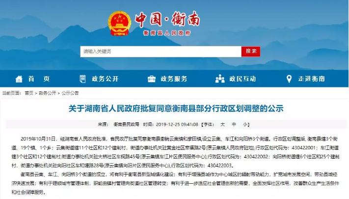 12月25日,衡南縣黨政門戶網(wǎng)發(fā)布《關(guān)于湖南省人民政府批復(fù)同意衡南縣部分行政區(qū)劃調(diào)整的公示》(以下簡稱《公示》)?!豆尽分赋觯?019年10月31日,經(jīng)湖南省人民政府批準(zhǔn),省民政廳批復(fù)同意衡南縣撤銷云集鎮(zhèn)和廖田鎮(zhèn),設(shè)立云集、車江和向陽橋3個(gè)街道。行政區(qū)劃調(diào)整后,衡南縣轄3個(gè)街道、19個(gè)鎮(zhèn)、1個(gè)鄉(xiāng);云集街道轄11個(gè)社區(qū)和12個(gè)建制村,街道辦事處機(jī)關(guān)駐黃金社區(qū)幸福路2號(原云集鎮(zhèn)人民政府駐地),行政區(qū)劃代碼為:430422001;車江街道轄3個(gè)社區(qū)和12個(gè)建制村,街道辦事處機(jī)關(guān)駐大橋社區(qū)車銅路45號(原云集鎮(zhèn)車江片區(qū)便民服務(wù)中心),行政區(qū)劃代碼為:430422002;向陽橋街道轄6個(gè)社區(qū)和25個(gè)建制村,街道辦事處機(jī)關(guān)駐向陽社區(qū)車和塘路28號(原云集鎮(zhèn)向陽片區(qū)便民服務(wù)中心),行政區(qū)劃代碼為:430422003。